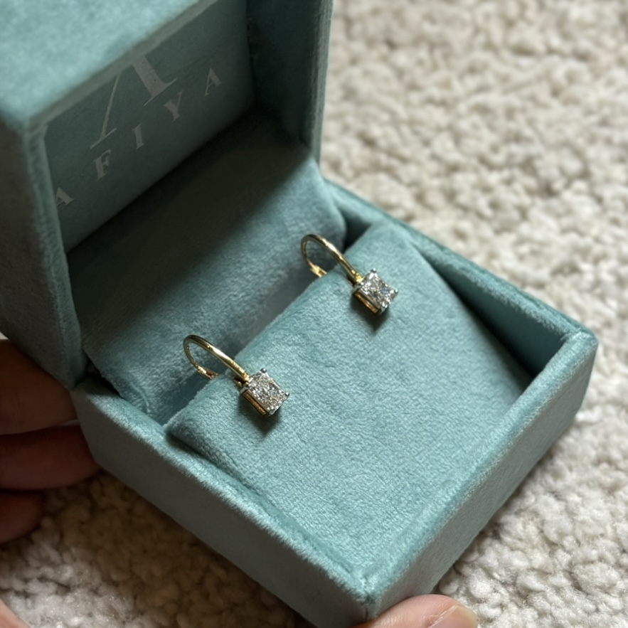 Gracefully suspended in a sleek gold setting, the Celeste Charm Earrings showcase square-cut diamonds that shimmer with timeless brilliance. Each stone is expertly faceted to capture light from every angle, creating a dazzling display of sophistication. Perfect for elevating both day and evening looks, the Golden Prism Earrings are a graceful blend of modern minimalism and classic charm..