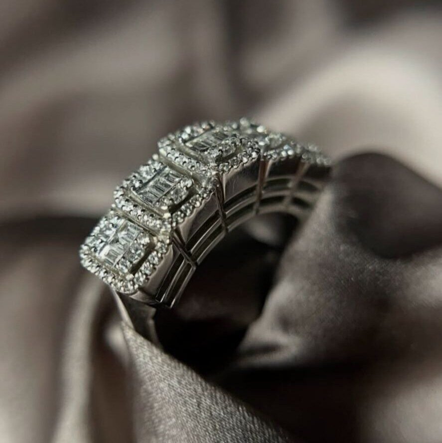 Trinity Gleam is a radiant celebration of symmetry and sparkle. This silver ring features three rectangular diamond clusters, each framed by a halo of delicate pavé-set stones. The trio of brilliance rests gracefully on a polished band, creating a refined silhouette that catches the light from every angle.